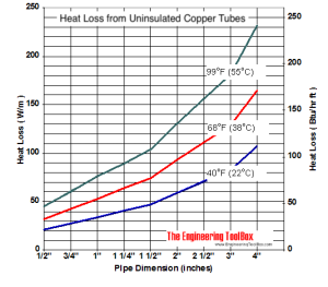 اتلاف حرارت در اختلاف دمای مختلف بین لوله و هوای محیط برای لولههای مسی ۱/۲ تا 3 اینچی در زیر نشان داده شده است.